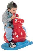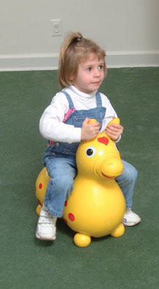 This unique play horse serves children up to four years old. Many speech therapists use this as a chiar in therapy. The up-and-down movement, or rocking movement that we use with infants to calm and organize, is featured in this fun play horse. The ears, used as handles, give ample security and control to a child. Rody can be partially deflated and it's bulb-shaped legs can be inserted into the rocking base. The rocking motion is great input. Later, the child will be able to use Rody as a hippity-hop for transitions. A child favorite...you'll wonder how you got along without a Rody!